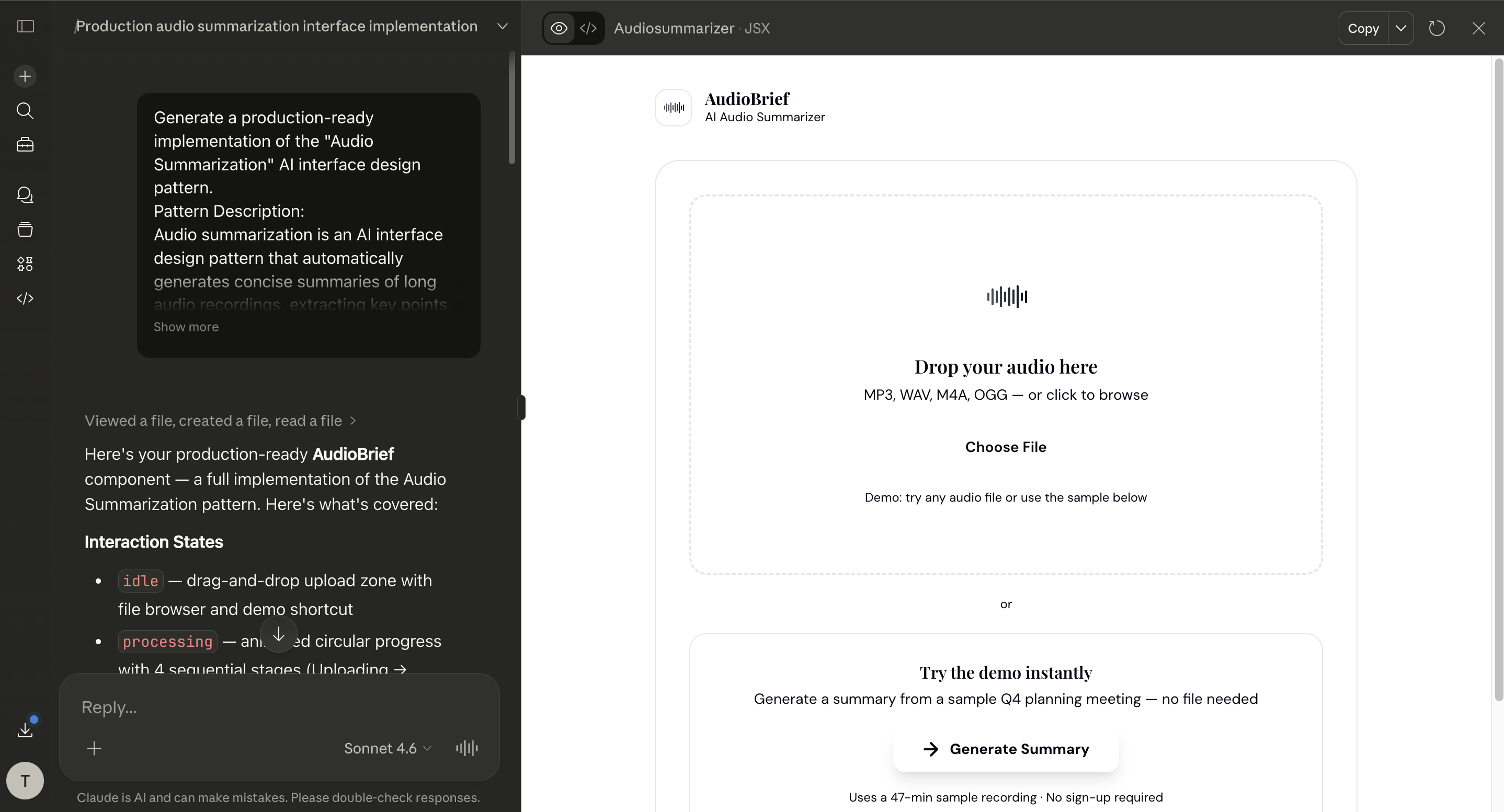 其中一個值得注意的觀察是,MagicPath 額外加入了「錄音」功能。雖然原始指令僅提到上傳音訊檔案進行摘要,並未要求即時錄音,但AI主動補充了此功能。這種延伸設計一方面提升了使用情境的完整性,使用者不僅能上傳檔案,也能直接使用同個工具錄音並生成摘要;另一方面,也提醒設計師在 AI 協作流程中,需要審慎評估自動補強是否符合產品策略與實際需求。