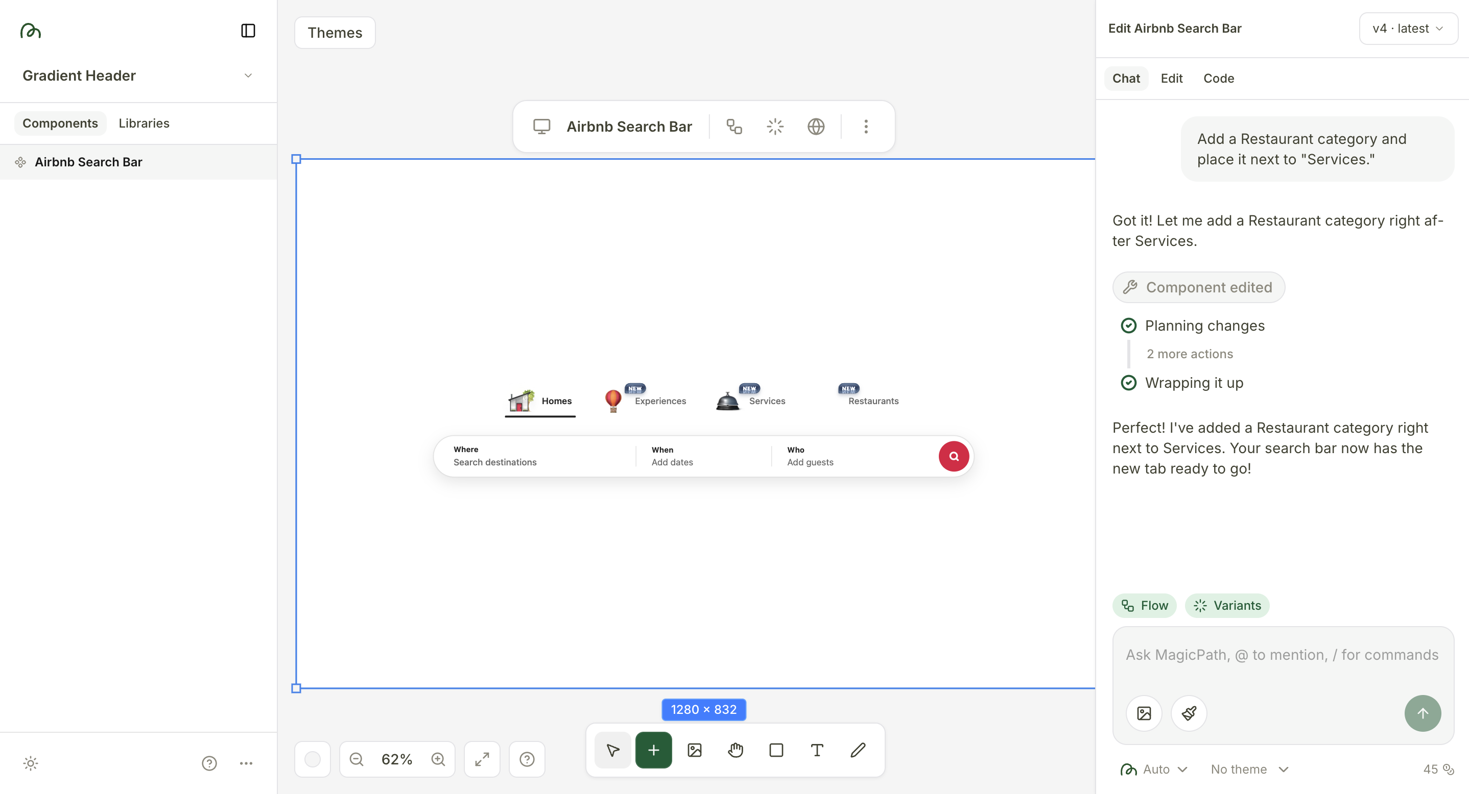 Claude並非專為介面設計打造,它的優勢在於邏輯推導與程式生成,因此產出的介面通常較為簡約、結構清晰。Lovable 允許使用者選取特定元素,針對指定區域下達修改指令,使調整更具局部精準性,適合在既有畫面上進行細部優化與快速迭代。MagicPath 則強調系統化建構流程,可先建立設計系統作為基礎,再生成畫面,生成後仍能透過下拉選單切換樣式或元件設定,並依照 Flow 流程逐步新增下一個畫面,較偏向從整體結構出發的產品設計方式。