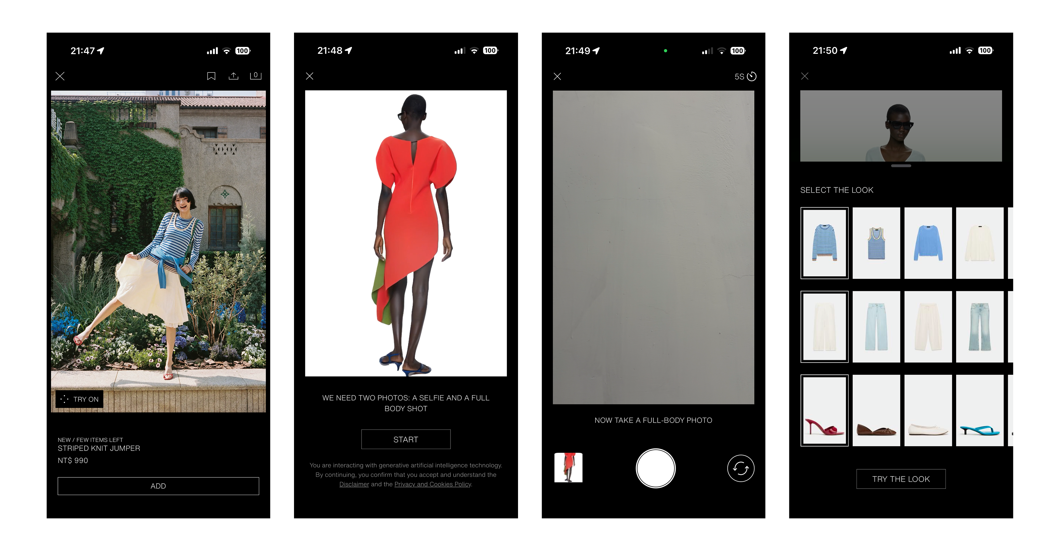 接著介紹目前僅限於ZARA應用程式使用的虛擬試穿功能 ,操作流程相當簡單,只需上傳一張臉部照與一張全身照,約兩分鐘即可建立個人化的數位分身,不需要專業拍攝,穿著合身的日常服裝、在光線充足的環境下拍攝即可。上船完成後,可以更換不同產品,包含鞋款,讓使用者看到完整的穿搭造型,這個設計同時解決了兩件事:幫助消費者做決策,也提升了品牌的交叉銷售機會。